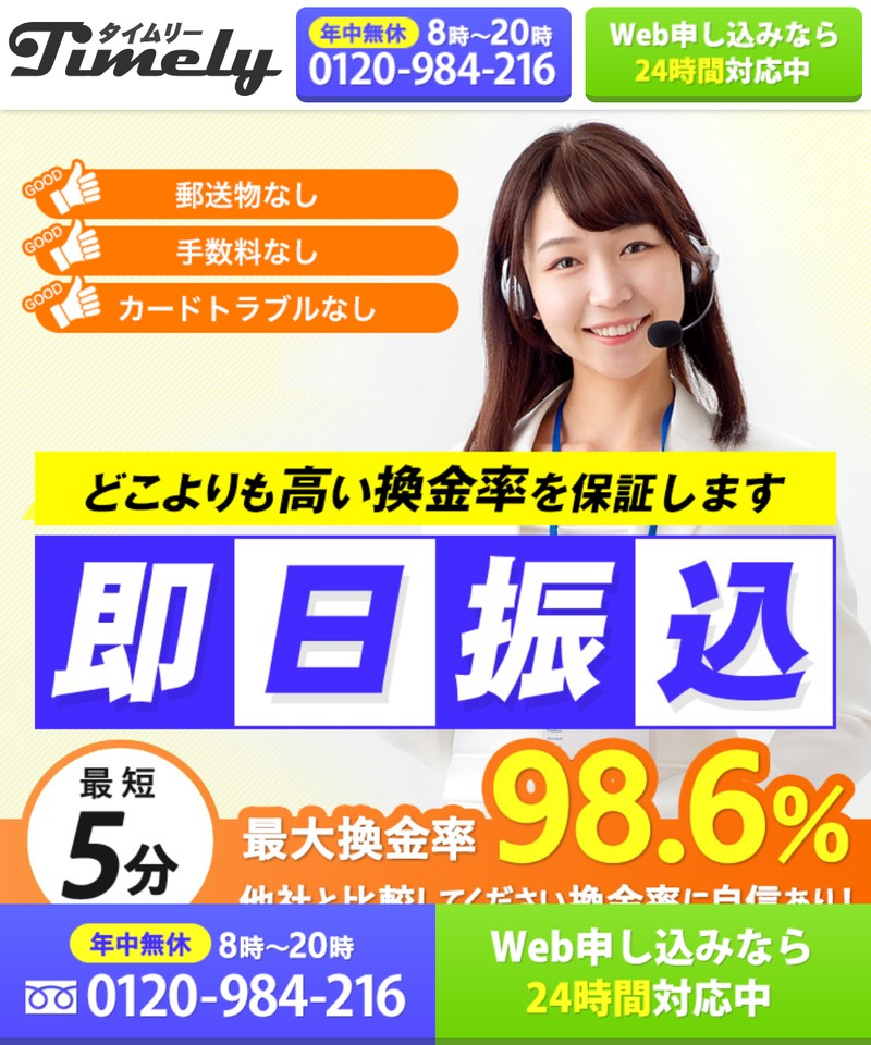 ![]() | 98.6% | 5分 | 9:00〜20:00 | 東京都中央区 | 毎月15日は換金率3%UP |